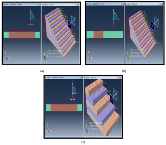 A 3D model is developed with geometry dimensions similar to experimental specimens which is shown in Table 4, Table 5 and Table 6. In comparison to natural specimen geometry, the geometry of the numerical model is made to appear as authentic as possible. A three-dimensional, deformable shell planar function is used to build the model. Figure 9 shows that three specimen geometry with different orientation. 7a shows the zero-degree fiber orientation and 14 plies, 9b shows the 90-degree fiber orientation with 14 plies, and 9c shows 5 plies with 0/90/0/90/0 plies orientation.