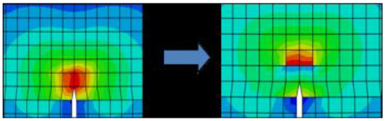 Whilst the matrix crack propagated across the fiber–matrix interface, it also deflects alongside the interface. Fracture mechanics and shear strength methods are the best ways to deal with the interface debond problem. The fracture mechanics method deals the fiber–matrix interface debonding as a crack propagation problem, in which the interface debonding [8,26] happens because the strain energy release rate at interface reaches debonding toughness. Moreover, the shear strength method is based on maximum shear stress criteria. Sun and Singh analyzed matrix multi-cracking and fiber/matrix interfacial debonding. However, for an extended interface debond period, the fracture mechanics approach provided a good fit. The fracture mechanics approach is used to determine the fiber/matrix–interface debonding, and is given as: Applied the XFEM step enrichment to model narrow damage localization zones as given in Equation (18) for interface debond energy and Equation (19) for the interface debond length. Table 6 shows the numerical evaluation and parameter of selection for failure in different scenarios.