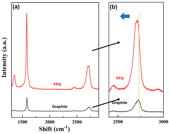 Exfoliation was confirmed using a Raman spectrum. The 2D band at 2717 cm−1 depicts the layer number and thickness of the sample (Figure 4). In the present study, a significant and single 2D peak for FFG can be observed, which is more intense and sharper than that of expanded graphite (Figure 4b). This peak of FFG is due to the presence of two phonons with the opposite momentum at the highest optical branch near the K point of the Brillouin zone [17]. In addition, a slight shift in the 2D peak towards the left (as indicated in blue in Figure 4b) was also observed after the exfoliation process. The intensity ratio of D band to G band is commonly utilized to evaluate the degree of structural defects (ID/IG) in graphene flakes [17,41]. During an initial shear exfoliation study, the ID/IG defect ratio was found to be 0.27, which is much lower than the defect ratio of 0.43 previously reported by Deshmukh and Kim [17] using the sonication method.