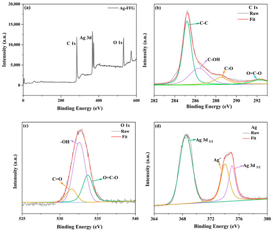 Figure 6. XPS characterization of AgFFG. (a) XPS survey spectra of AgFFG; (b) high-resolution C1s XPS spectrum; (c) high resolution O1s XPS spectrum of AgFFG; (d) high-resolution Ag3d XPS spectrum of AgFFG.