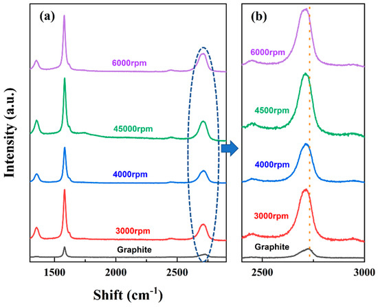 Figure 7. (a) Raman spectra of the prepared FFG at different rotational speeds using shear exfoliation; (b) magnified 2D bands of the spectra.