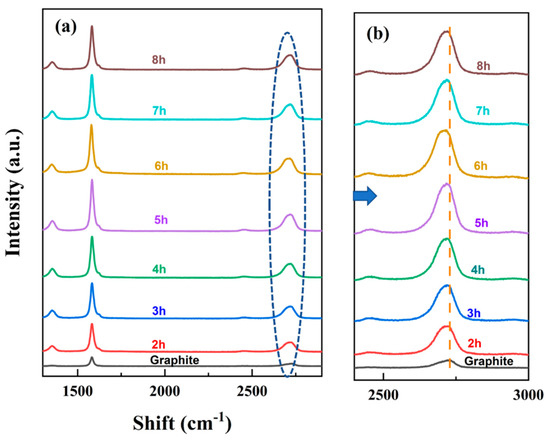 Figure 8. (a) Raman spectra of the prepared FFG at different exfoliation time; (b) magnified 2D bands of the spectra.