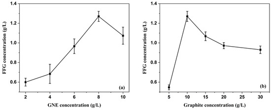 Figure 9. (a) Effect of GNE concentration and (b) initial graphite concentration on FFG concentration during the exfoliation process.