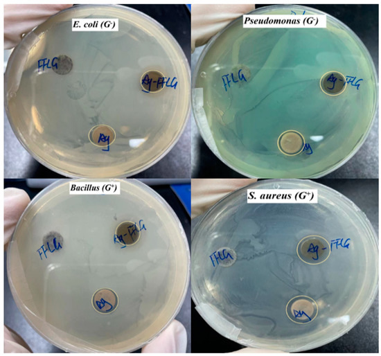 The antibacterial activity of the prepared Ag–FFG nanocomposites was studied using the agar well disk diffusion method against different bacterial strains (belonging to four genera: Staphylococcus aureus ATCC 6538 (Gram-positive), Escherichia coli ATCC 11775 (Gram-negative), Bacillus megaterium KCTC 2194 (Gram-positive), and Pseudomonas aeruginosa PR3 (NRRL strain B-18602) (Gram-negative). All bacteria were initially cultured on nutrient agar medium and incubated at 37 °C for 24 h. Bacterial culture (100 μL) of optical density (OD) 1.0 was spread on Luria Bertani (LB) agar plate. In each Petri plate, three wells with 110 mm diameters were corkscrewed and filled with 100 µL each of FFG, Ag salt, and Ag–FFG. Plates were kept inside the incubator at 37 °C for 24 h. After incubation, the inhibition zones on the plates were recorded as inhibition against microbial species [30,31,32].
