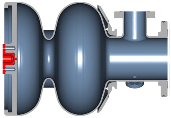 Reflection-mode K2CsSb has been also planned for the 1.5-cell SRF gun developed at Helmholtz Zentrum Berlin. The cathode is placed inside the RF filter, which is cooled with 80 K gaseous helium (Figure 9). Because this gun is designed for high-current purposes, the most important key for successful operation is the sufficient cooling of the cathode, where a heat load on the photocathode as high as 30 W is expected []. Otherwise, cathode overheating could lead to sequential consequences, starting with photocathode evaporation, cathode plug destruction, and even causing the quality degradation of the superconducting cavity.