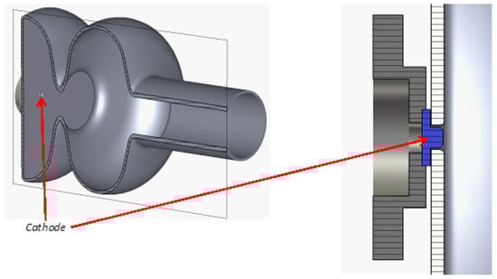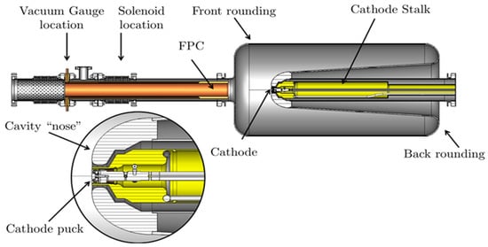 A metallic photocathode with a nano-patterned surface will obtain plasmonic effects to increase the absorption of light and enhance the local electromagnetic field intensity [,]. This effect can be also used for the superconducting photocathode material, for example, niobium. The team from Jlab and RadiaBeam has proposed a promising new design with a 1.6-cell 1.3 GHz cavity and a special cathode plug cooled with liquid helium (Figure 3).