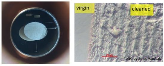 Photograph of Mg photocathode Mg#214 after second laser cleaning (left) and surface structure changes after cleaning (optical microscope image, (right)) [].