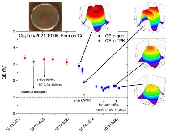 Nearly every 3 months, the cathode is changed due to the low QE or poor QE distribution. The cathode QE before and after installing it into the gun is controlled routinely with a laser of 0.1 mW low power. When a new cathode is inserted into the gun, the MP around the cathode structure is one critical issue, leading to vacuum instability and thus to the first QE degradation. Furthermore, when the CW RF is loaded, the QE drops down to typically about 1% (Figure 5). However, sometimes the QE distribution is still possible to change dramatically during CW beam extraction, which strongly influences the beam emittance due to the inhomogeneous thermal emittance and space charge effect. The thermal emittance of Cs2Te in the HZDR SRF gun (0.6–1.2 µm/mm) is found strongly coupled to the QE distribution. The area with higher QE shows higher thermal emittance.