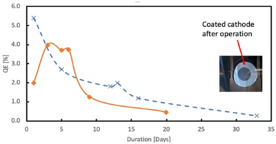 The cathode QE evolution in the BNL SRF gun with CW RF but a pulsed beam. Solid orange curve: the cathode exposed to MP; dashed blue curve: the cathode not exposed to MP [].