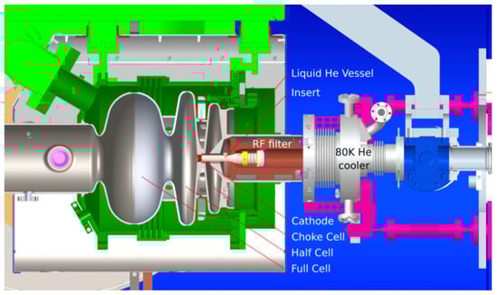 Cross-section of the HZB SRF photoinjector. The cathode is installed in the RF filter and cooled with liquid nitrogen [].