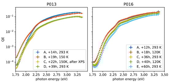 Spectral response of K2CsSb cathodes (sample #P013 and#P016) during the cryogenic cooling experiments performed in the HZB photocathode preparation chamber [].