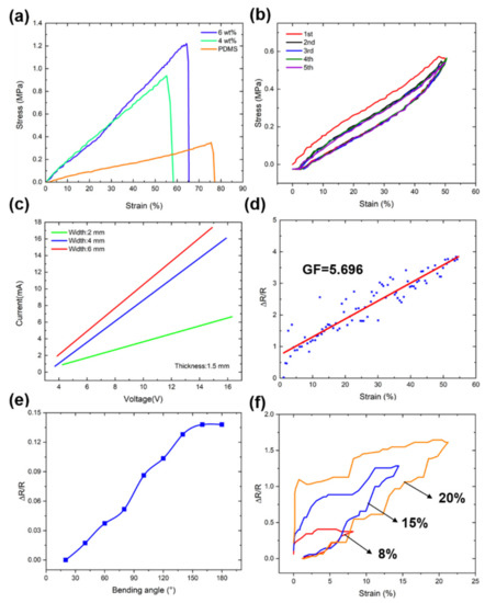 (a) Stress–strain curves of the CB/PDMS composites and PDMS; (b) cyclic stress–strain curves of five experiments; (c) current–voltage curves of the CB/PDMS composite with different widths at a thickness of 1.5 mm; (d) relative resistance change–strain curve of the CB/PDMS composite; (e) the relationship between the bending angle and resistance change; (f) electrical hysteresis curves of the CB/PDMS composite at strains of 8%, 15%, and 20%.