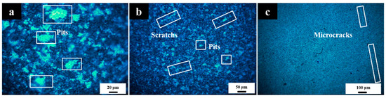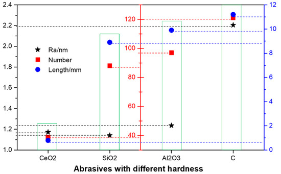 The influence of polishing pressure on surface defects is analyzed through the experimental results (medium hardness polyurethane polishing disc, revolution speed of 50 r/min, particle size of 0.1 μm). It can be seen from Figure 11 that with the decrease of polishing pressure, the surface damage of components begins to improve obviously, but when it decreases to about 15 kPa, the number and length of damage points will no longer decrease, but fluctuate in a small range and tend to be stable, as shown in Figure 10. It is possible that when the pressure is higher than 15 kpa, the coarser abrasive will be pressed into the grinding disc at a greater depth and turn into two-body grinding behavior, resulting in scratches on the surface micro cutting process. When the loading pressure is reduced to 15 kpa, the number of effective Abrasives between the polishing disc and the element surface decreases by a certain value and remains stable. Even if the load pressure is further reduced, the change of tangential resistance and friction coefficient is very small, so the continuous reduction of load at this time cannot significantly improve the surface quality. In the actual processing process, because the removal efficiency at this time is very low, and the residual defects of the previous process cannot be effectively removed, the generation of surface defects can only be controlled to a certain extent by reducing the load. Such experimental results verify the MD simulation to some extent. By reducing the processing pressure, surface defects cannot be completely avoided.
