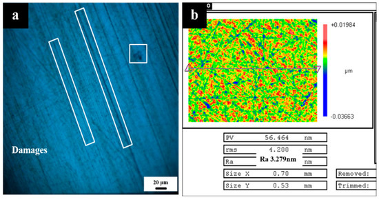 Crystal surface topography (a); and surface roughness (b) after pre-polishing.