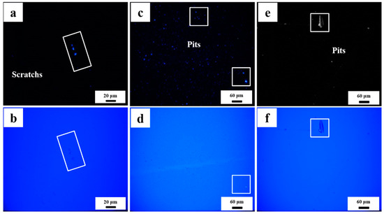 As shown in Figure 3, the macro defect morphology on the surface of the element is detected by scattering light/dark field imaging. Figure 3a–f are dark field and bright field images at the same position respectively. Although the fine polishing process removes a depth layer of about 3~5 microns on the surface in order to remove the defect layer of the previous process, there are still defects in the form of pit, scratch, and micro crack on the surface after fine polishing. These defects seriously reduce the service performance and service life of laser crystal elements, and further affect the operation stability of the laser system. Starting from the defect generation process and the influence of defects on the surface structure in the ultra-precision machining of laser crystal components, this paper is committed to providing a theoretical basis for the low defect machining of laser crystal surface through the research on the surface defect generation mechanism and material removal mechanism.