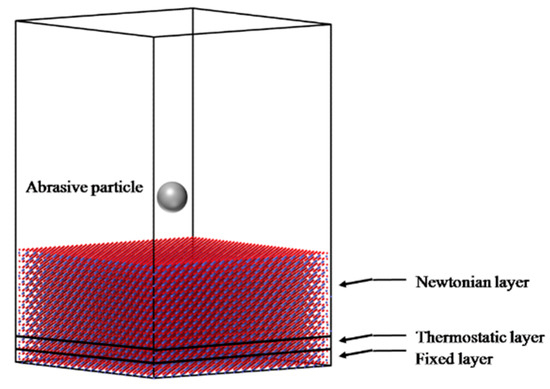 As shown in Figure 4, we have established a crystal model of 110.4 Å × 110.4 Å × 50.7 Å containing 48,001 atoms. The model is divided into three parts: Newtonian region, thermostat region, and frozen region. The atoms in the Newtonian region follow the Newtonian dynamic and are used to simulate the whole process. The Langevin thermostat is applied to the thermostat region to simulate the heat dissipation process and stabilize the temperature of the model. The atoms in the fixed region are completely fixed to support the whole model. Among them, the thickness of the thermostat region and frozen region are 5 Å and 8 Å, respectively. Spherical abrasive particles are added by the ‘fix indent’ command in large-scale atomic/molecular massively parallel simulation (LAMMPS). The diameter of the particles is 30 Å. Its interaction with the sample is described by the following formula: