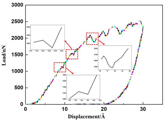 Figure 5 shows the change of load with displacement when the abrasive particles approach the substrate surface at a moving speed of 2 Å/ps. The applied load shows several drops in the figure. The first load drop is located at the displacement of 9.3~9.9 Å, which is also known as the ejection effect, which is related to the initial plasticity of the base material. The second load drop is located at the displacement of 11.7~12.3 Å, which is attributed to the maximization of the amorphous layer. The third load drop is at 16.2~18.3 Å, which may be due to the sudden increase of distortion layer.