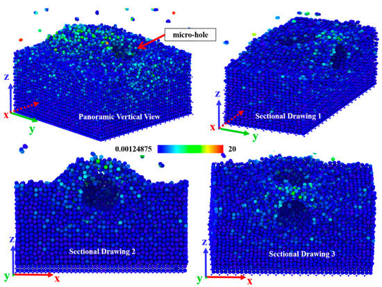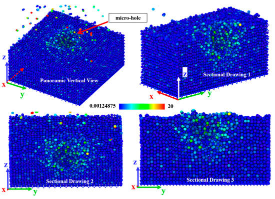 As shown in Figure 6, when the abrasive particles only have normal pressure on the surface of the element, the atoms at the stress position on the crystal surface have been displaced, and micro surface defects (atomic peeling/displacement) will be observed. ReaxFF MD simulation shows that at this time, because there is no shear effect caused by tangential friction, the atomic displacement basically occurs in the z-axis direction, and the directly stressed position. Except for the atoms removed from the structure, the rest of the stressed atomic structure is compressed, and the original lattice structure is deformed, which shows that there are micro “holes” on the material surface.