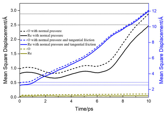 Based on the calculation of mean square displacement (MSD) in MD simulation, we calculated the dynamic tendency of a single atom during friction, as shown in Figure 8. Compared with the stable Re2O3 crystal system, the mean square displacement (MSD) of atoms in the system increases rapidly whether the surface is only subjected to normal pressure or both normal pressure and tangential friction, in Figure 8. In the presence of tangential friction, the diffusion of atoms in the system becomes particularly intensified, which is affected by the increase of system temperature caused by friction heat generation. The increase of thermal diffusion leads to strong distortion of surface and subsurface lattice, which is also proved in the next chapter. At the same time, it can be found that compared with the stable and orderly bulk material structure, the sharp increase of MSD after friction and extrusion indicates that the surface structure becomes loose and disordered. According to Hertz contact theory, if the contact deformation is elastic, no material loss is expected [27]. However, our data show that even if the contact pressure (as shown in Figure 5) is much smaller than the bulk material elastic modulus (197.21 GPa) and shear modulus (80.85 GPa, the data were measured by the UMS-200 advanced TECLAB ultrasonic echo material characterization system), the surface of the base material will still have micro defects due to structural distortion.
