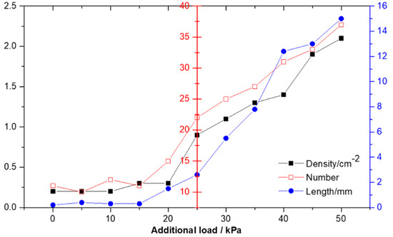 The real grinding and polishing process is closer to the second case in the model. The existence of a normal load is bound to be accompanied by tangential friction. Thus, we choose to simplify the real processing conditions, carry out grinding and polishing on the CCOS machine tool, fix other process parameters, adjust the polishing pressure, and study the impact of load on surface defects. The statistical results of surface defects under different processing pressures are shown in Figure 10 and Figure 11.