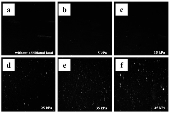 Typical defect distribution diagram of components under different additional loads (a) zero load; (b) 5 kPa; (c) 15 kPa; (d) 25 kPa; (e) 35 kPa; (f) 45 kPa.