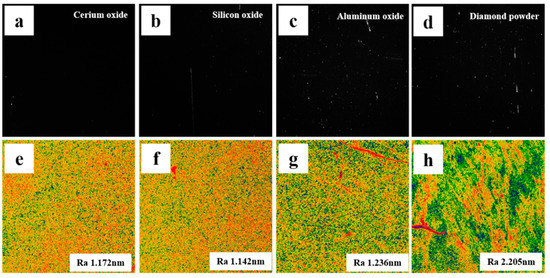 Typical defect and roughness distribution diagram of the component surface under the action of abrasive with different hardness (a) CeO2 and (e) Ra 1.172 nm; (b) SiO2 and (f) Ra 1.142 nm; (c) Al2O3 and (g) Ra 1.236 nm; (d) C and (h) Ra 2.205 nm.