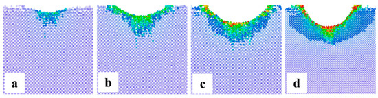 As shown in Figure 14, we discussed the structural amorphization and its effect on the surface structure. The amorphization starts directly below the abrasive particles, and the obvious amorphization layer and distortion layer begin to appear at the depth of 3.0 Å. With the increase of indentation depth, the distortion layer becomes wider gradually, but the amorphous layer does not increase further with the increase of indentation depth after it is stable at 10.5 Å. The reason may be that the outer atoms bear pressure directly, and the high compressive stress caused by the increased loading makes the amorphous region expand and thin along the contact surface.