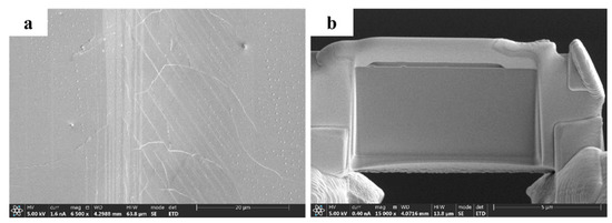 Using a spherical grinding head, scratches were generated on the crystal surface under the condition of constant normal load and tangential friction, and observed under a low power microscope, as shown in Figure 15a. At low magnification, it can be found that in addition to the main scratch direction, there are some tree-shaped cracks spreading around, which may be caused by repeated extrusion and friction at the same position. Due to the brittleness of the Tm: GdScO3 laser crystal, under the normal phase load far less than the elastic modulus of the crystal, the tree crack around the main scratch also proves that the atoms in the direct compression area fall off, and cause the obvious displacement of nearby atoms, resulting in the appearance of dendritic brittle crack.