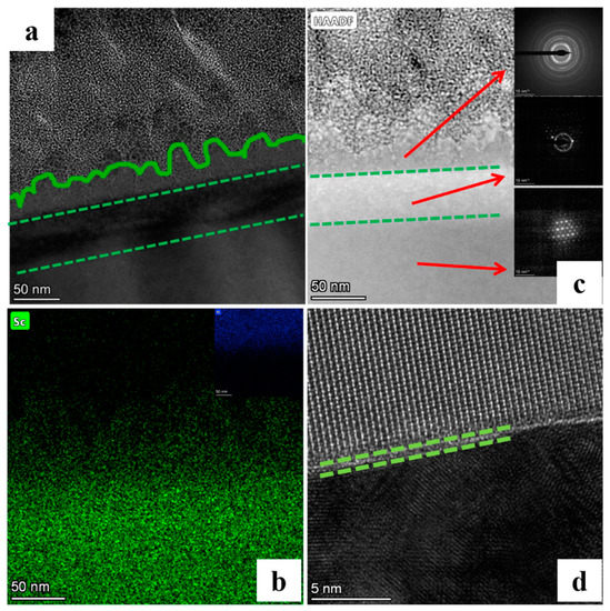 As shown in Figure 16a, it can be seen from the HTEM image of the scratch position that the scratch layer (direct stress layer) presents a concave-convex structure (green curve), which has an obvious boundary with the sub surface layer, and the sub surface layer is unevenly distributed due to its proximity to the stress layer. As shown in Figure 16b, mapping scanning can find that the atoms of the concave convex scratch layer are loosely arranged relative to the matrix atoms and gradually become disordered. As shown in Figure 16c, three states of the scratch damage layer can be found by mapping scanning: the atomic arrangement of the directly stressed layer is distorted, and the diffraction image shows amorphous information; in the sub surface layer structure, both crystalline and amorphous exist, while the substrate structure still retains the original complete crystal structure. We believe that the scratch damage layer is composed of an amorphous layer with a thickness of 40–50 nm, a distortion layer with a thickness of 50–60 nm, and a substrate layer. As shown in Figure 16d, the HRTEM image of the distortion layer shows that there are many defects in the structure, including stacking faults, torsion, and dislocations. This may be because it is close to the stress layer, and the atomic displacement of the stress layer drives the synchronous displacement of the sub surface layer. In addition to brittle cracks, although the phenomenon of atomic peeling in the sub surface layer is very rare, many large-depth atomic displacements directly cause the phase change of the layer. This will be reflected in the change of micro mechanical properties of the material, and may also make the use effect of the material fail to reach the ideal state that the base material should perform to a certain extent.
