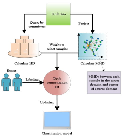 In this study, we aimed to mitigate the effects of distorted data distribution and degraded performance of the E-nose due to sensor drift. We sought to combine an active learning approach and domain adaptation to complementarily enhance the sensor’s performance in the identification of drifting gases. Specifically, we designed a semi-supervised cross-domain active learning (CDAL) model for drift compensation of the E-nose. As shown in Figure 1, for the CDAL method, we used the AL paradigm based on the query by committee (QBC) model to calculate the Hellinger distance (HD) of the distribution of predicted outcomes for each target domain sample committee member, which was used to measure the ease of differentiation of the selected samples. Additionally, we measured the interdomain distribution difference of the data by calculating the maximum mean difference (MMD) of each target domain sample with respect to the source domain center. Finally, we weighted the HD and MMD as the final sample selection criterion, by which the drift compensation samples are selected for the update of the classification model. The new CDAL method considers both the information content of the selected samples and the migration differences and improves the drift compensation performance of the sensor through a combination of domain adaptation and active learning. The method was able to reflect the maximum amount of drift information with a minimum number of labeled samples. To the best of our knowledge, the combination of active learning and domain adaptation has not been used for drift compensation of E-nose sensors.
