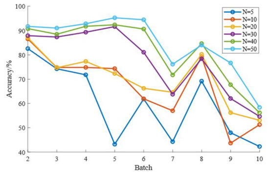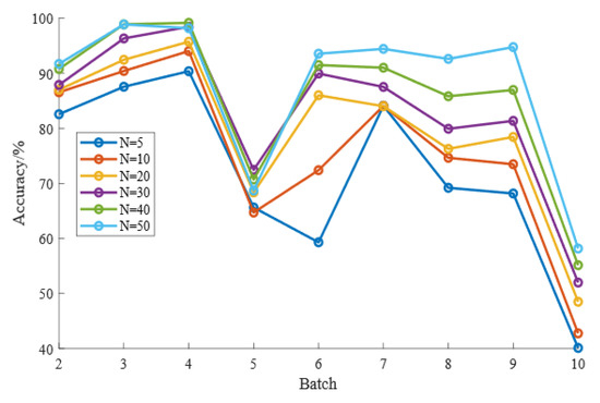 CDAL requires a weighting rule based on MMD and HD to select samples from the target domain for labeling, so the size of the number of labeled samples, , can have an impact on the recognition results. It is necessary to observe the effect of the value of on the effectiveness of the CDAL method. To prevent the effects of overfitting or a small number of markers, we varied the setting of to {5, 10, 20, 30, 40, 50}. Figure 4 and Table 6 show the effect of the value of on the long-term drift identification results, and Figure 5 and Table 7 show the effect of the value of on the short-term drift results.
