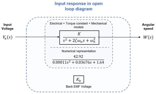 By substituting from Equation (7) into Equation (6) and substituting from Equation (6) into Equation (5), the system can be expressed as the relationship that exists between the angular speed (output—) and the input voltage , that is,
