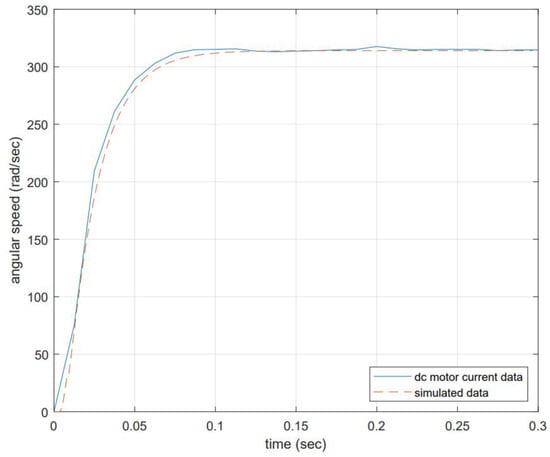 The DC motor response is compared to the proposed model, and the results are shown in Figure 4. The input voltage is 12 volts at no-load conditions, and the expected angular speed equals 314.16 rad/s.