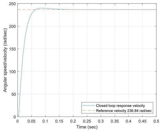 PID controllers or their combinations are used to control either BDC or BLDC motors. PI controller controls the angular speed, current, and commutation [25]. PID controller developed for the closed-loop simulation based on the stability analysis that shows the system is stable and controllable (the poles are both negative and on the real axis ( and ). The Routh–Hurwitz matrix confirmed stability (no sign changes in the first column). PID gains are calculated using the auto-tune function in Simulink™ values selected to avoid actuator saturation as follows: , and . Those gains produce an under-damped response, not exceeding 10% of overshoot and they reach settling time in approximately 0.2 s when a step of 9 volts is used as input. The closed-loop block diagram is shown in Figure 7, and its response to 9 volts step input is shown in Figure 8.