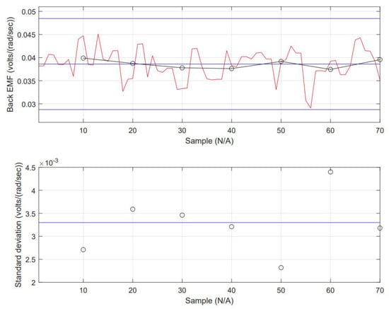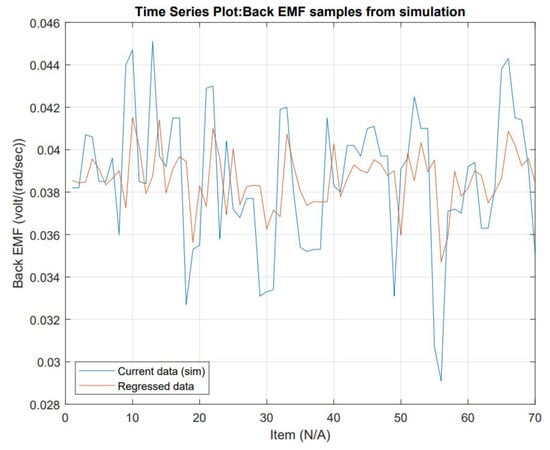 The collected data from the simulation can be considered a time series. Verifying the dataset is essential to determine the model that fits better to forecast Back EMF. Stationary criteria are critical to selecting a model, depending on the statistically significant lags, from either the following: Auto-Regressive (AR), Moving Average (MA), including the Integrated (I) aspect (lag reduction), Auto-Regressive Moving Range (ARMA) or Auto-Regressive Integrated Moving Range (ARIMA). Forecasting data is a challenge when it goes far from the last sample. Going back to the stationary check, the data’s nature can be determined. The data’s mean () is constant (this can be interpreted as the mean contrasted to subgroups averages and is not changing drastically). The standard deviation () is also constant. There is no seasonality (not an evident repetitive pattern in time). The inspection of input data is shown in Figure 9. The mean equals 0.0386 and local averages are close. The standard deviation equals 0.00327 with no excessive variabilities in data along the total sampling. All these are shown in Figure 9.