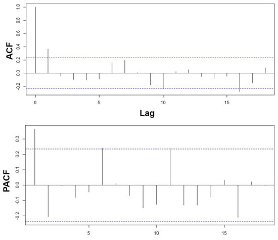 The Auto-Correlation Function (ACF) and the Partial Auto-Correlation Function (PACF) are used to determine the number of components the model will include, see Figure 10. The ACF helps more for MA models, while PACF is better for finding the number of elements for AR models. ACF is a good tool for checking the randomness of the data; this is appropriately defined as the Box–Jenkins Auto-Regressive formulation. In MA(q), the ACF helps to determine which lags are statistically significant, then define the order of the MA model [28]. PACF can be seen as the correlation between two variables after being adjusted for a common factor affecting them. Considering the formulation proposed by Yule–Walker, which accounts for the formal definition for PACF, for an AR(p) process, it is understood that the vector of for any uses the last coefficient, called the partial Auto-Correlation of the process at lag k, as the cut off after lag p. This suggests that the PACF can be used in identifying the order of the AR(p) model [27].