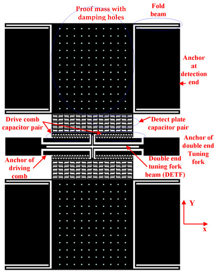 The accelerometer structure layer is divided into two identical single-beam resonant accelerometers at the middle symmetry point in the Y-axis direction, as shown in Figure 1. Taking the upper part as an example, the structure layer includes a sensitive proof mass with some damping holes, four folded beams (single or double stage) supporting the suspended proof mass, a detection plate capacitor pair, two fixed-drive comb capacitor pairs, a tuning fork resonant beam, and some fixed anchors(two anchors at the detection end, two anchors for the driving comb, and two anchors for the double-end tuning fork). The Y-axis direction is the drive and detection direction.