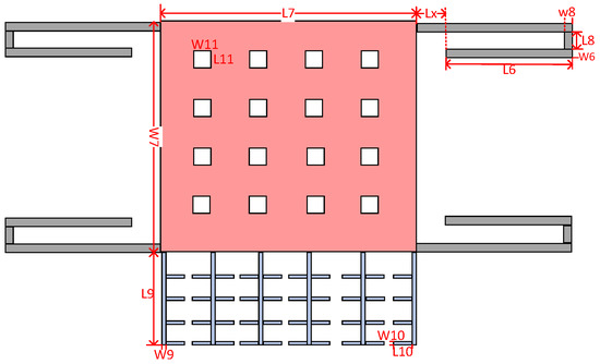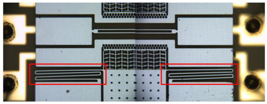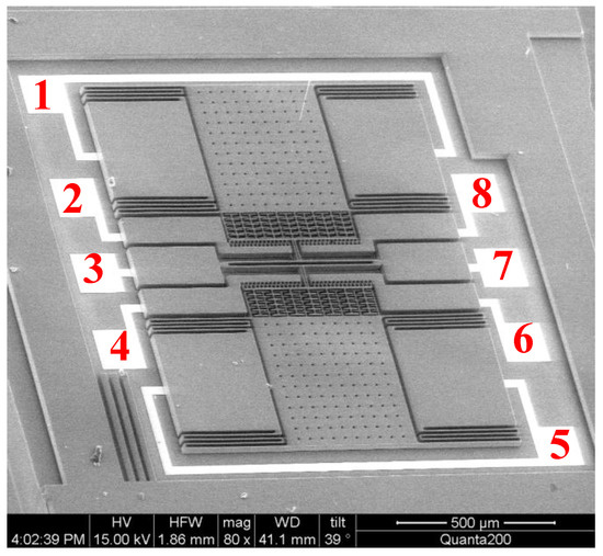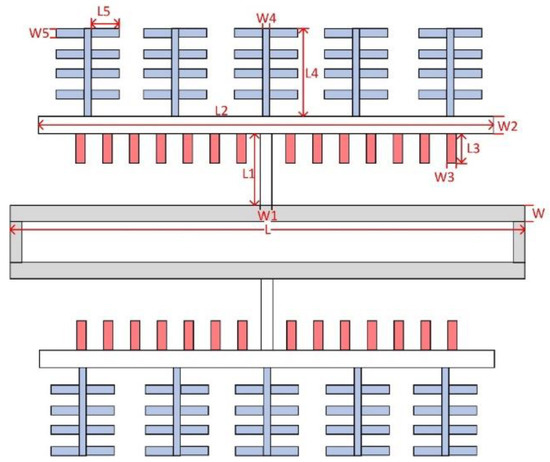 In Formulas (14)–(16), is the Young’s modulus of silicon, is the density, is the area of the additional structure, is the number of comb capacitors, represents the pairs of parallel plate capacitances, is the number of parallel plate capacitors, and other parameters are as shown in Figure 3.