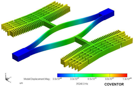 In the simulation, attention was paid to the influence of the length L and width W of the tuning fork beam on the resonant frequency. Finite element simulation of the resonator structure was performed using CoventorWare software [15]. First, the 3D model was constructed according to the microstructure’s ideal process flow, and the resonant beam’s anchor points were constrained to be fixed, and then the modal simulation of the resonator structure was carried out. The first-order in-plane mode of the resonant structure is shown in Figure 4. When the length of the tuning fork beam was 700 μm and the width was 8 μm, the theoretically calculated resonant frequency was 38,296 Hz, the simulated frequency was 35,136.1 Hz, and the error was 8.99%. The stiffness of the resonance beam obtained from the simulation was 153.04 N/m and the theoretically calculated stiffness was 163.0439 N/m.