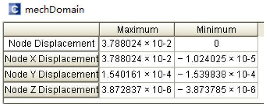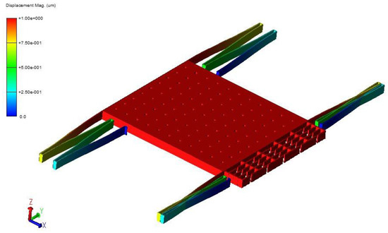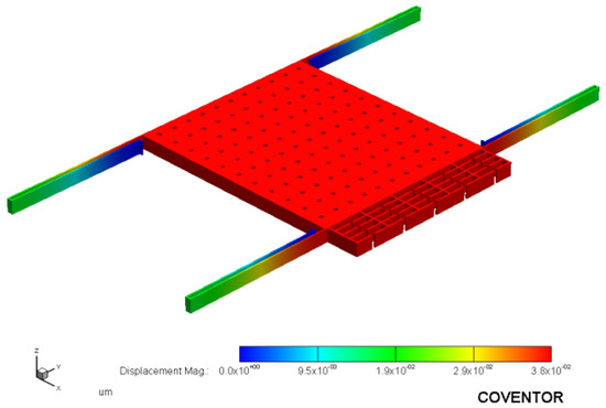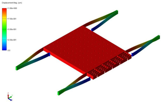 According to Equations (17) and (18), ignoring the influence of the connecting beams, when the length and width of the straight beams are the same, the stiffness of the double-stage folded beam is half that of the single-stage folded beam. When the length of the single beam is 445 μm and the width is 4 μm, the stiffness of the single-stage folded beam can be calculated to be 10.31 N/m, and that of the corresponding double-stage folded beam is 5.15 N/m, making the modal stiffness of the resonant beam more than 15 times the stiffness of the single-stage folded beam and the stiffness of the double-stage folded beam . After completing the 3D modeling of the microstructure in CoventorWare software, the force analysis of the sensing structure was performed to obtain the fold beam’s simulation stiffness, and the detection end anchor points were fixed, as shown in Figure 6. Different accelerations in the sensitive direction to simulate the force were applied, the displacement in the sensitive direction was measured, and the expression obtained the simulation stiffness of the fold beam , When the acceleration is 1 g, the simulation results are shown in Figure 7. The displacement results obtained after applying different accelerations in the X-axis direction (sensitive direction) are shown in Table 1 and Table 2. According to the simulation results, the stiffness of the folded beam under the experiment was9.4398 N/m and 5.1127 N/m, respectively. The relative errors from the theoretical stiffness were 8.44% and 0.71%, respectively.
