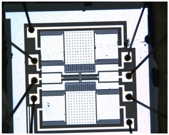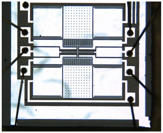 The structure layer was composed of monocrystalline silicon material doped with concentrated boron to improve the conductivity of the microstructure [13]. The substrate was pyrex 7740 glass, and the anode bonded the microstructure and the substrate [7]. For larger depth and width ratios, three photolithography analyses were conducted with an inductive coupled plasma (ICP) emission spectrometer) [14]. Under the condition ofthe etching depth being 40 μm, the metal electrodes were welded after tape-out. The fabricated single-stage and double-stage folded beam accelerometers are shown in Figure 10 and Figure 11. The structure was complete and there was no microstructure fracturing orshort-circuiting. The electrode layer had eight electrodes, as shown in Figure 11, of which the third and seventh electrodes connected to the tuning fork beam were short-circuited. There weretwo groups of driving combs on the upper and lower sides; each group of combs had two electrodes. The second and eighth electrodes were short-circuited and connected with the driving voltage, the same was true of the fourth and sixth electrodes, and the same was true of the first and fifth electrodes.