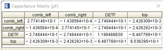 In selecting driving and detection voltages, we needed to estimate the value of the driving and detection capacitances first, before the driving and detection voltages were finally converted into electrostatic forces through the capacitances. The entire microstructure was symmetrically divided into two equal parts, the top and bottom. The CoventorWare software was used to establish the physical simulation model of the detection capacitance and the driving capacitance. Differing from the previous modal simulation and force analysis, the mesh setting for the microstructure must be performed after the 3D modeling of the equivalent micromechanical resonant accelerometer was completed. The electrostatic field’s finite element analysis was selected, the relevant constraints were set on the microstructure, and the capacitance matrix was finally obtained [17]. The finite element simulation results show that the comb capacitance of the left and right parts of the fixed driving comb and the tuning fork beam was 0.2748 pF; that is, the two driving capacitances were both 0.2748 pF. The detection capacitance formed by the flat plate on the proof mass and the flat plate on the tuning fork beam was 0.6488 pF, and the coupling capacitance between the fixed driving comb and detection plate was 0.002426 pF. The simulation results are shown in Figure 13.