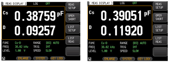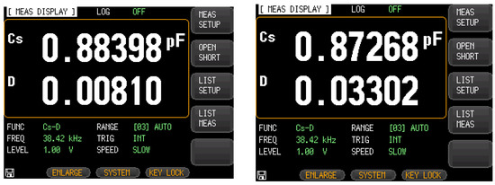 The probe of the LCR measuring instrument was used to clamp the corresponding pins after packaging and adjust the measurement excitation frequency. Figure 14 shows that the driving capacitance values of the single-stage and double-stage folded beam accelerometers were 0.88398 pF and 0.87268 pF, and the corresponding detection capacitances were 0.38759 pF and 0.39051 pF, respectively, as shown in Figure 15. Considering the fixture and welding of metal leads and the process manufacturing errors, the test results and simulations were found to be of the same order of magnitude and basically consistent.