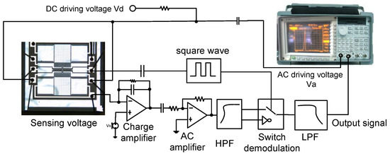To obtain the quality factor and resonant frequency, an Agilent 35670A dynamic signal analyzer was used for the open-loop frequency sweep test. The third and seventh electrodes were connected to an 866 kHz square wave, and the fourth and sixth electrodes were both connected to DC and AC drive voltages. The DC-regulated power supply provided the DC voltage, and the AC voltage was supplied by the output port of the dynamic signal analyzer. The detection voltage is provided by the manual programmable potentiometer divider and was connected to the positive input terminal of the charge amplifier of the interface circuit. The detection capacitor was output through the charge amplifier, DC blocking amplifier, high-pass filter, switch demodulation module, and low-pass filter, and then connected to the input of the dynamic signal analyzer. The circuit schematic is shown in Figure 16.