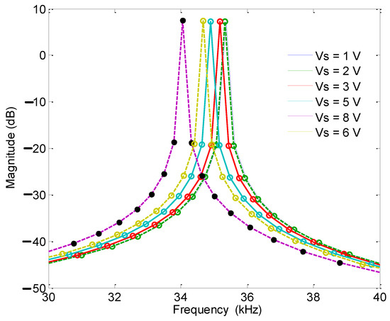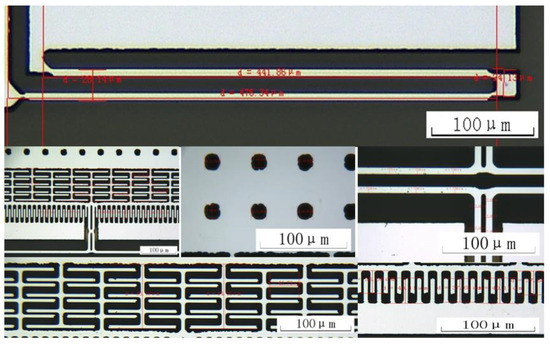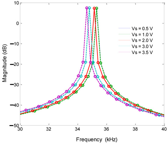 Before microstructure encapsulation, the computer vision method was used to directly mark the length and width dimensions, as shown in Figure 25. Table 3 shows the structural parameters designed and measured. Combined with the quality factor of the experimental test, the numerical model of the accelerometer (including the interface charge amplifier) was obtained, and the numerical model was established under Matlab/Simulink. The external inputs were acceleration, detection voltage, DC driving voltage, AC driving voltage, and white noise, and the output terminal was the charge amplifier, as shown in Figure 26. The linear analysis tool was used to analyze the amplitude–frequency characteristic curves under different detection voltages, as shown in Figure 27. At 30–40 kHz, the resonant frequency was decreased by changing the detection voltage from 1 V to 4 V. The amplitude–frequency curve was asymmetrical, but the simulated vibration amplitude was slightly smaller than that of the experiment, and the detection voltage corresponding to the frequency reduction was inconsistent. The simulation error was related to the circuit parameters of the interface. As the interface circuit focuses on the frequency measurement [18,19,20], the effect of the error under small amplitude on the frequency measurement can be ignored.