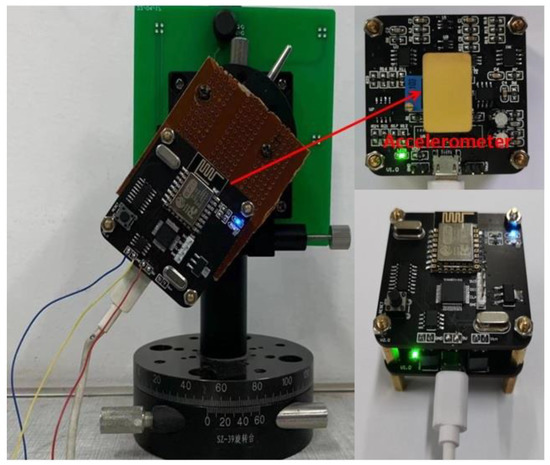 The self-made rotary slide and dial could achieve a precise adjustment of 0.5°, providing acceleration input from −1 g to 1 g through gravity decomposition. The test instrument is shown in Figure 19, and the corresponding voltage supply mode remained unchanged.