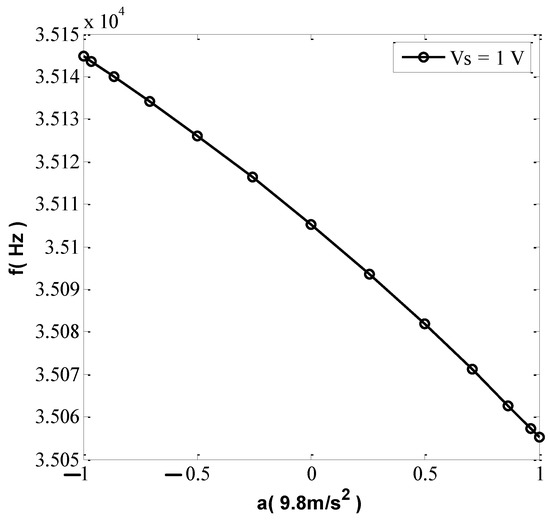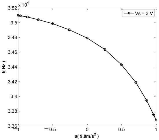The encoder was adjusted to achieve an angle difference of 15° of rotation and decompose the acceleration into the corresponding sine components. When the detection voltage changed to 1 V and the corresponding acceleration rotation angle was from −90° to 90°, the relationship between acceleration and resonant frequency was as shown in Figure 20, and the sensitivity was 44.5 Hz/g. When the detection voltage was 3 V, the relationship between acceleration and resonant frequency was as shown in Figure 21. A large detection voltage corresponds to a high sensitivity, but the resonant frequency and acceleration have a severely nonlinear relationship.