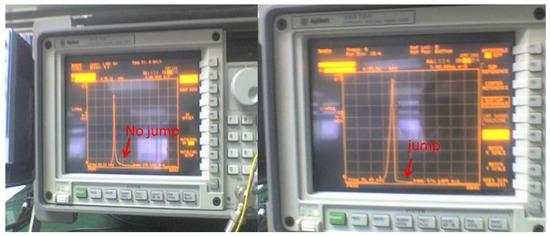 The amplitude of the AC drive voltage was kept unchanged, and the DC stabilized power supply was adjusted to change the DC drive voltage. When the DC detection voltage is 3 V, the amplitude–frequency curve does not jump; when the DC detection voltage is 5 V, there is a jump in the amplitude–frequency curve. See Figure 22 for the curve. The larger the DC driving voltage was, the more the resonant frequency was inclined toward the direction of frequency increase. The analysis showed that the microstructure featured a nonlinear coupling of amplitude and frequency when the driving voltage and detection voltage were large [15].