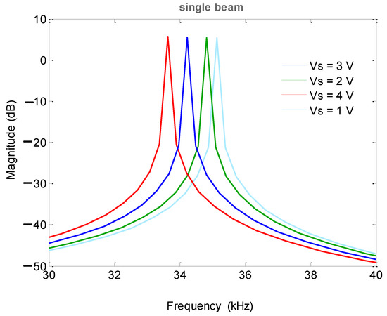 where the frequency is related to the structural parameters and the detection voltage. The sensitivity can be improved by adjusting the loading voltage , but the sensitivity is nonlinear with . The greater the stiffness of the folded beam is, the smaller the sensitivity will be. It is necessary to configure the parameters reasonably in the structural design. The preceding analysis was conducted under the condition —that is, the influence of the tuning fork beam on the resonant frequency due to the electrostatic force and inertial force can be ignored.
