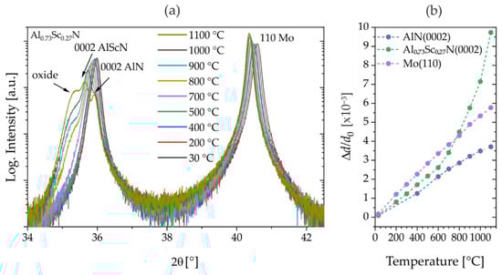 XRD in situ (with oxygen atmosphere) annealing experiments on Al0.73Sc0.27N and AlN thin films grown on Mo(110)/AlN(0001)/Si(001) (sample set #1). (a) 2θ/θ-scan: Evolution of 0002-reflection profile of Al0.73Sc0.27N and (b) relative changes in lattice spacings d with temperature calculated from AlN(0002) and Al0.73Sc0.27N(0002)/Mo(110)-reflections.